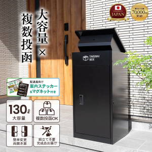 この宅配ボックスは 工事不要・据え置きタイプ で、玄関先や敷地内に簡単に設置できるのが魅力。屋外設置を前提とした耐久性に配慮し、住宅外観にも馴染むデザインで、既存住宅でも導入しやすい仕様となっている。サイズや容量の異なる複数モデルが用意されており、住まいの条件に合わせた選択が可能だ。